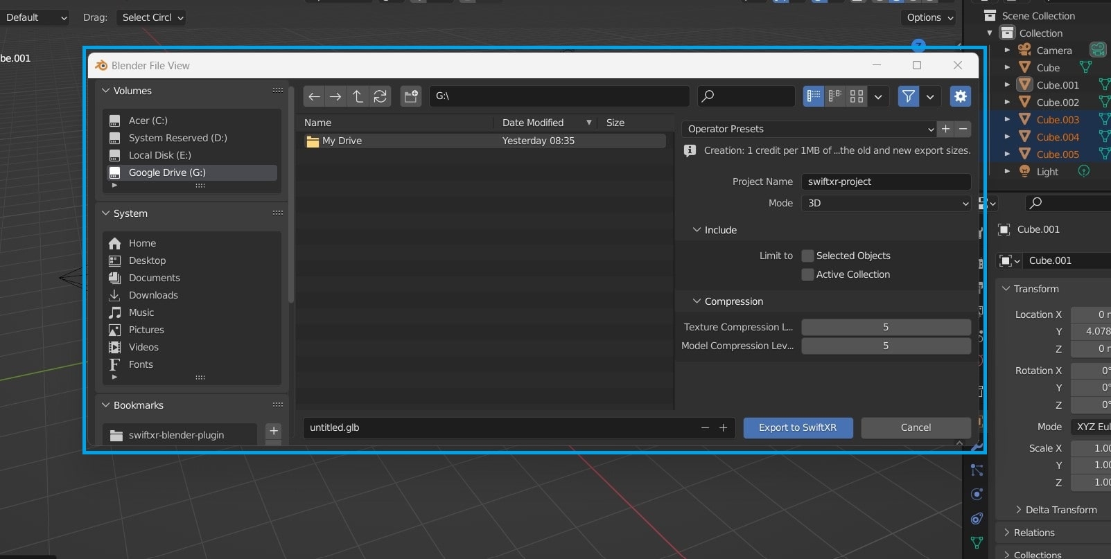 After you've created your 3D scene in Blender, it's time to export it for use in SwiftXR. Click on File > Export > SwiftXR (3D/AR/VR) Viewer to bring up the SwiftXR Exporter options. Here, you can specify the project name (which will be used to generate the website URL), the export mode (3D or AR), the assets to include, and the compression level.