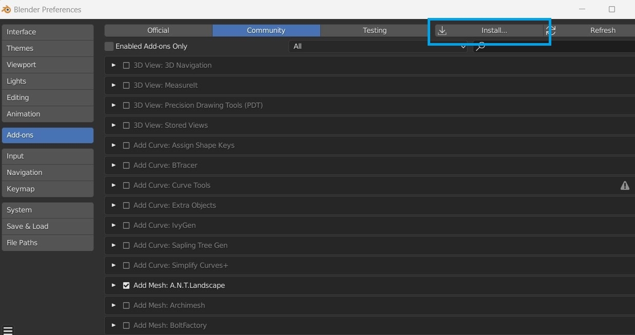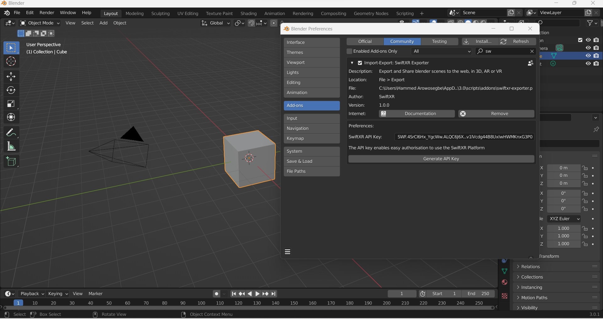 To get started, download the SwiftXR (3D/AR/VR) Add-On for Blender from here. Once you've downloaded the Add-On, open Blender and navigate to Edit > Preferences > Add-ons. Click on the "Install" button and select the swiftxr-exporter.py file.
