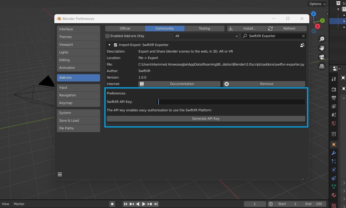 To generate an API key, you'll first need to create a SwiftXR account (if you don't have one already). Once you've created your account, navigate to the SwiftXR Settings page and click the "Create API Key" button to generate a new API key. Copy the API key and input it into the SwiftXR Exporter Blender preference.
