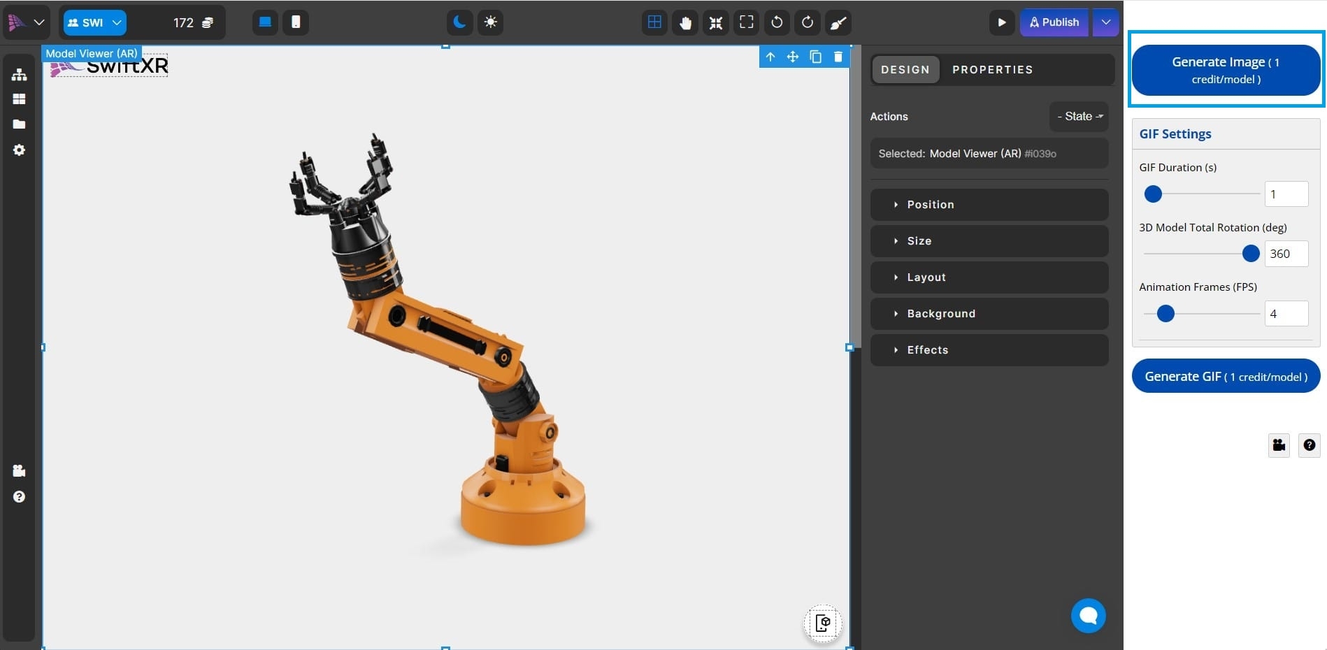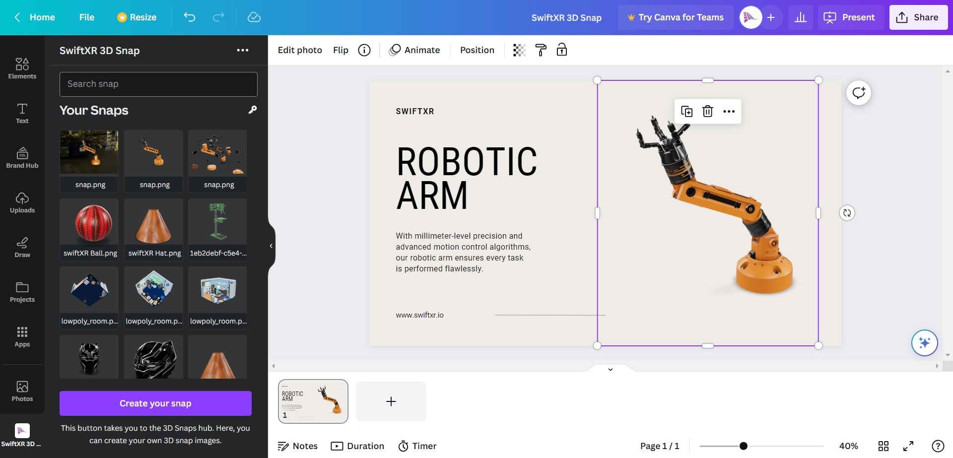 SwiftXR is a powerful platform for creating and sharing interactive 3D, augmented reality (AR), and virtual reality (VR) experiences on the web. With the SwiftXR 3D Snap Plugin for Canva, you can easily export your 3D scenes and models as pictures or gifs from the SwiftXR Platform directly into your Canva project, enabling you to showcase your work to clients and colleagues in an immersive, interactive format.