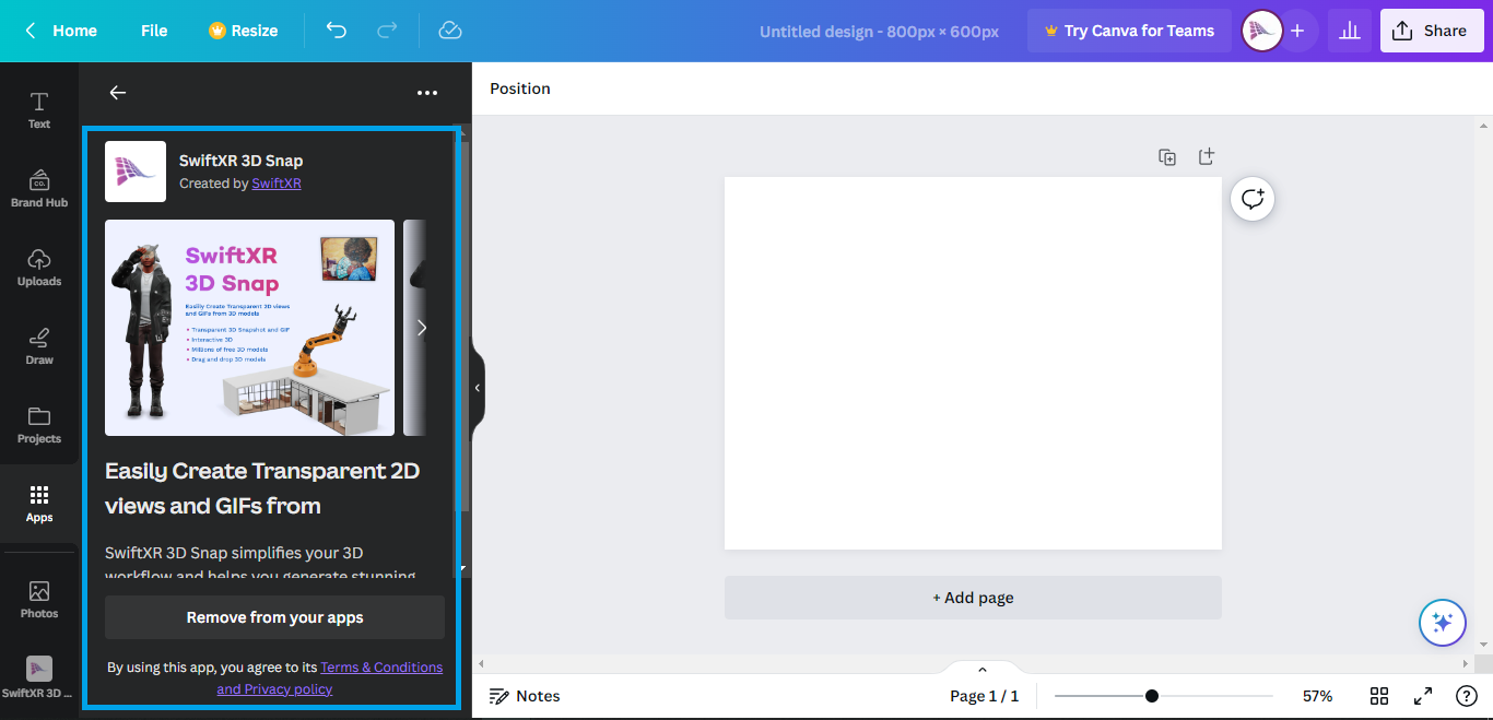 To get started, Click on "Apps" and search for "SwiftXR 3D Snap" from the Canva Apps Marketplace. Once you've installed the App, the SwiftXR Icon should appear on the bottom of the Canva sidebar.