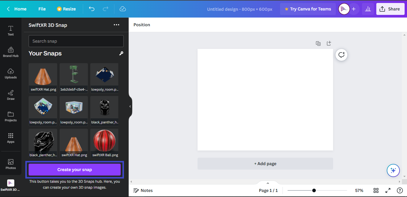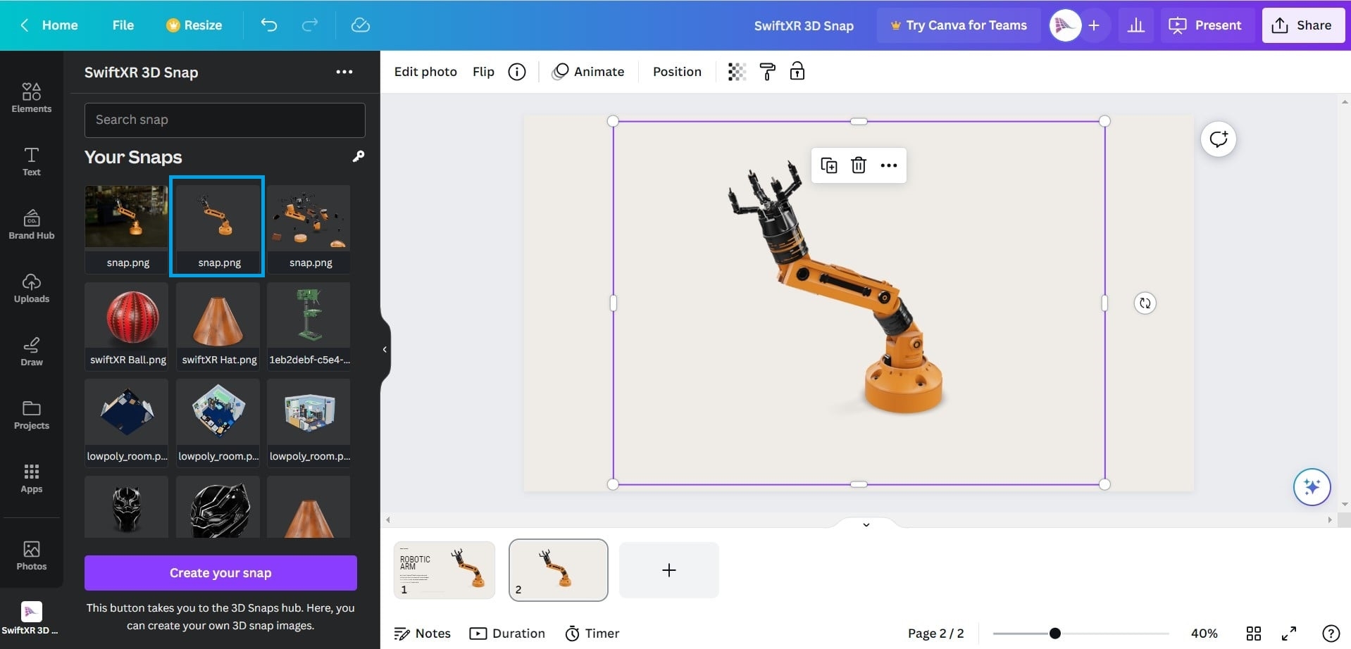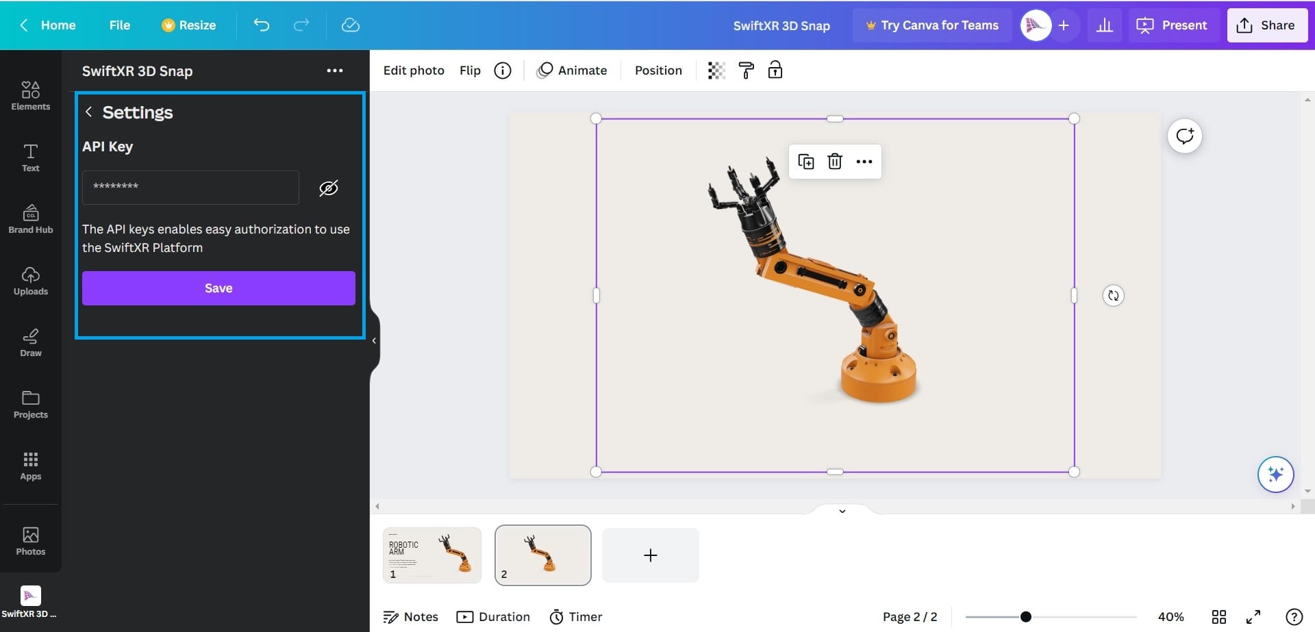 With the SwiftXR 3D for Canva, you can quickly and easily generate 3D Snaps for you to use on Canva , bringing your designs and creations to life in an interactive and immersive format. If you encounter any issues, be sure to send an email to [email protected] or discord page for live support.