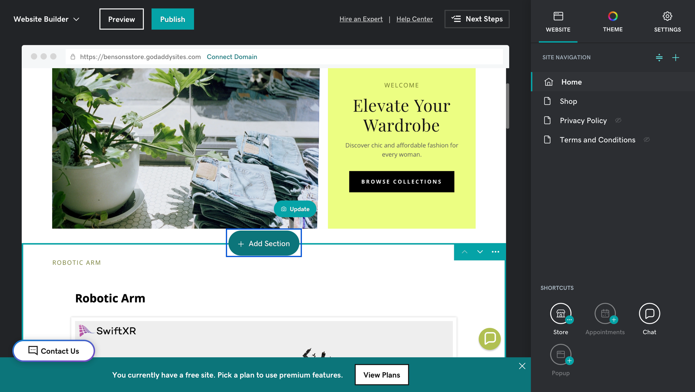 SwiftXR is a powerful platform for creating and sharing interactive 3D, augmented reality (AR), and virtual reality (VR) experiences on the web. With the SwiftXR (3D/AR/VR) Integration for GoDaddy, you can easily integrate SwiftXR Projects into your GoDaddy prototypes/websites, enabling you to create immersive and interactive web experiences.
